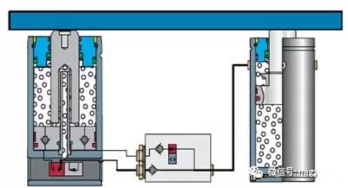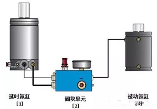 该系统采用标准锁紧型氮气弹簧,阀块与被动氮气弹簧联接;控制表监控被动氮气弹簧压力,阀块上的压力表监控标准锁紧型氮气弹簧的压力;有2个压力开关分别与标准型氮气弹簧、阀块联接,分别控制其插装阀的开闭,以此实施完全锁紧型延时功能。