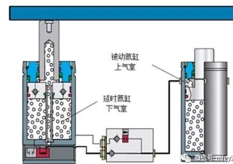活塞杆到达下止点位置时,上气室压力大于下气室压力,活塞杆被锁住,机床滑块回程时,活塞杆不会马上向上返回,起到延时可控的作用。